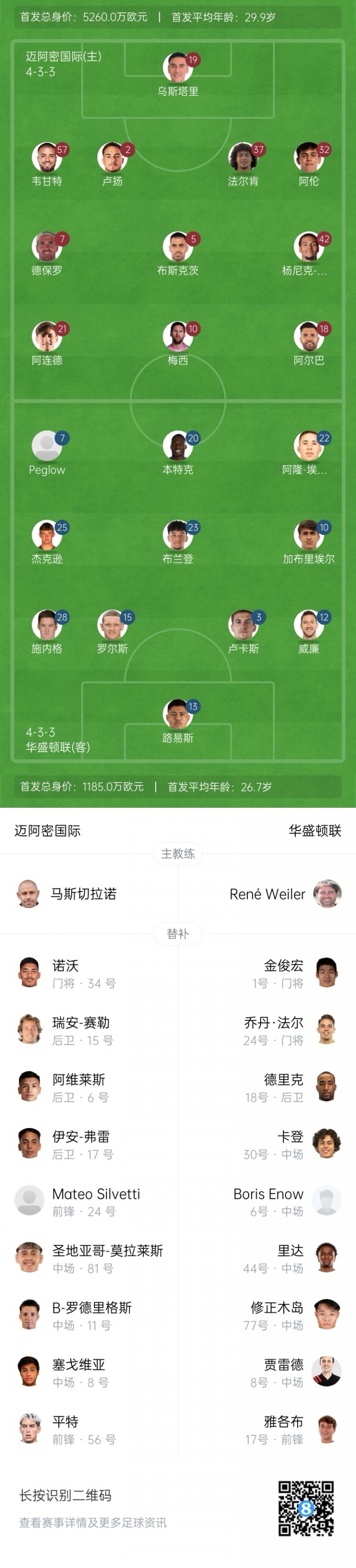 迈阿密国际后备 :34-诺沃、17-弗雷、15-瑞安-赛勒、81-圣地亚哥·莫拉莱斯、6-阿维莱斯、56-平特尔、8-特拉斯科、11-B·罗德里格斯、24-马特奥·西尔维蒂