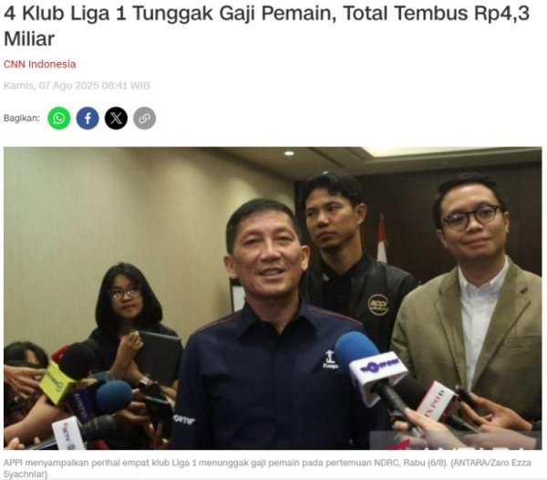 印尼媒体:四支印尼超级职业联赛 球队拖欠球员共近200万人民币工资