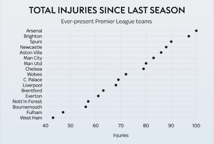 (上图:持续征战的英超球队中在线扑克安全网站,自上个赛季以来的各队总负伤 人数)