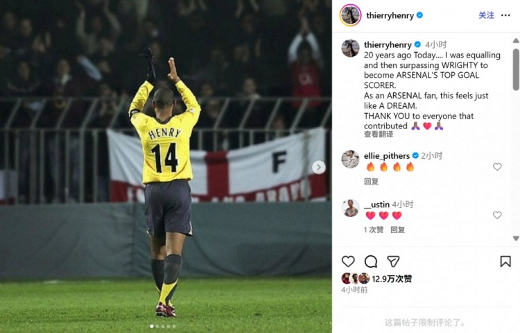 亨利社媒晒照纪念:20年前的今天我成为枪手第一射手,就像一场梦