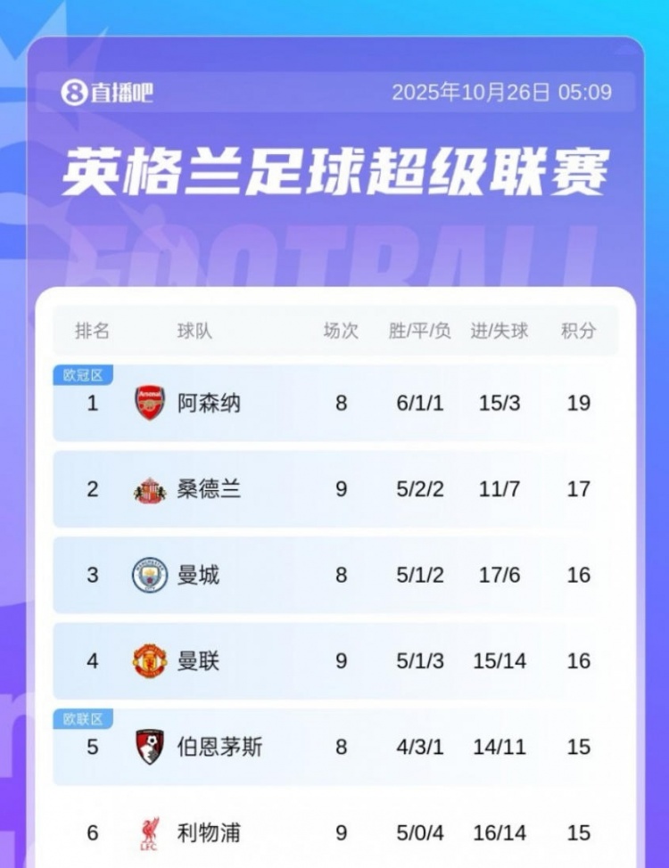 10月26日讯 2025-26赛季英超第9轮,曼联4-2战胜布莱顿,升至积分榜第4,暂时和榜首的阿森纳相差3分。