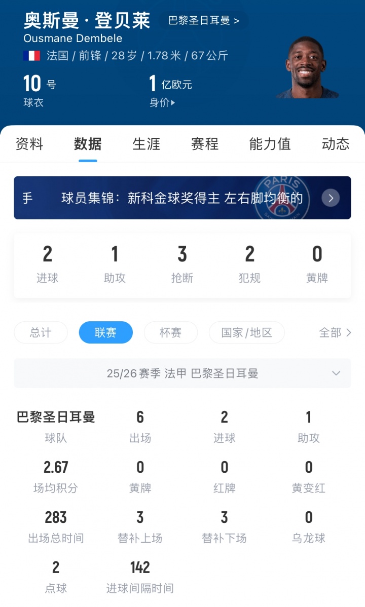 这是28岁的登贝莱本赛季第三次负伤 ,苏超直播在线观看他本赛季已经缺席了16场赛事 中的7场,伤缺44天。他本赛季至今仅为巴黎出战6场法甲、2场欧冠和1场欧超杯,贡献3球2助,共计425分钟,其中仅在欧超杯打满全场。