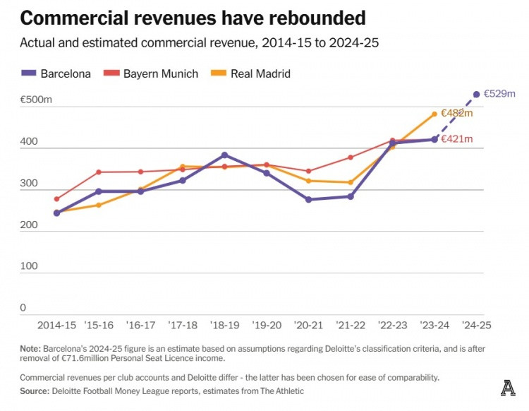 增长仍在延续。巴萨将PSL收入计入商业项,但即便视其为一次性收益剔除,按德勤口径估算,其商业营收可能仍冲破 5亿欧元。