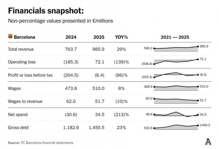近年想理清巴萨财务状况近乎天方夜谭,其复杂程度如同对战九头蛇——刚厘清一笔复杂交易,立刻又冒出两笔新的。这家加泰罗尼亚豪门在10月公布24/25赛季财报时,宣称实现了“全方位经济复苏与运营效率提升”。
