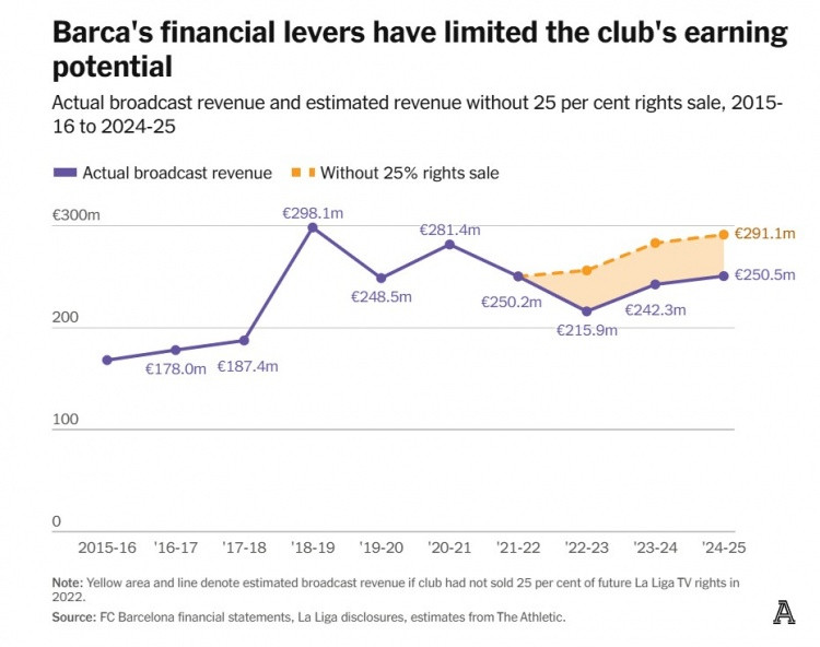 自与第六街交易以来,巴萨已移交约1.2亿欧元转播收入,占杠杆融资额的18%。即便西甲转播权价值直至2047年合同到期维持不变,巴萨放弃的转播收入总额将达10亿欧元——比2022年出售权益所得高出50%。实际上,这笔交易相当于一笔利率3.5%的25年期贷款,且这还是在转播权不增值的前提下。