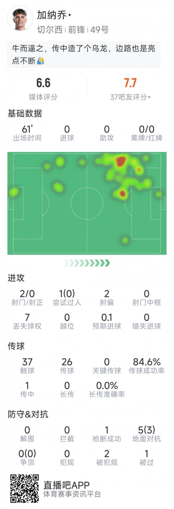 加纳乔本场数据:制造乌龙,2射0正,1次抄截 ,5对峙 3成功