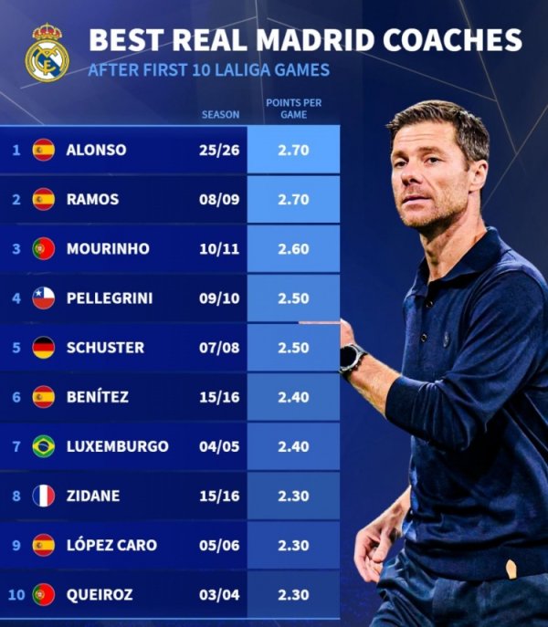 皇马主帅前10场西甲场均拿分榜:阿隆索2.7分并列居首,穆帅第3