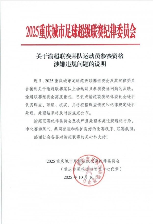 足球投注实时赔率 10月18日讯 据“封面新闻”报道,10月16日,2025重庆城市古代足球 超级职业联赛 组委会发布《关于渝超职业联赛 某队运动活动 员参赛资格涉嫌违规问题的说明》,确认正在调查某队运动活动 员参赛资格问题。随后,又有自媒体博主在社交平台,曝出一份“违规参赛处罚陈述通知”的文件。该文件直接点明,正在接受调查的某队为北碚缙云鼎久队,违规球员为李俊杰,他也出现在了2025中乙职业联赛......查看更多