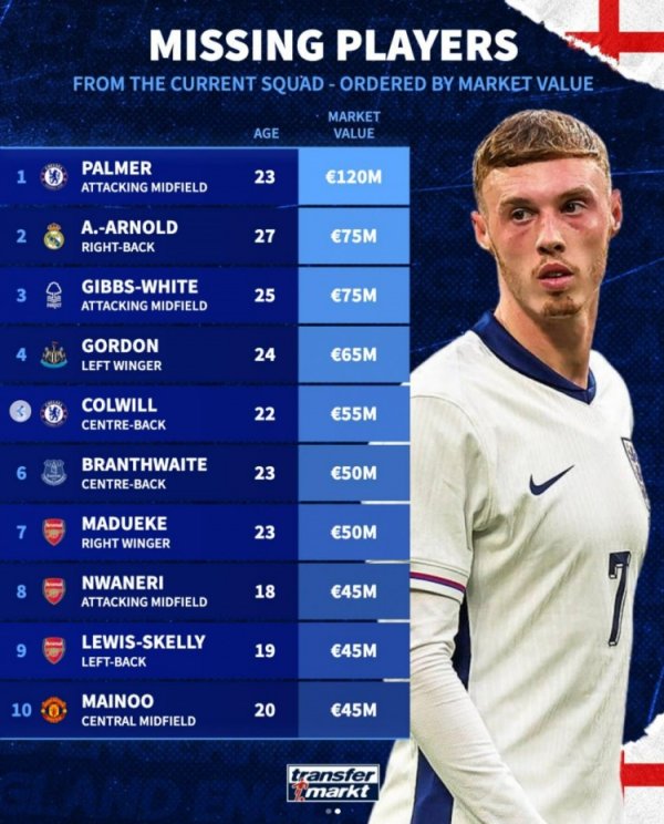 德转列缺席本期英格兰名单身价榜:帕尔默居首,阿诺德次席